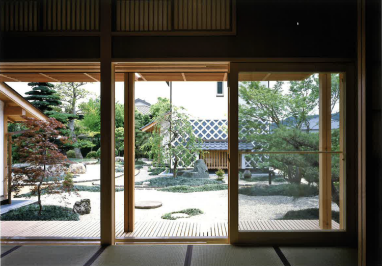 飾り窓の向こうに中庭があり、地袋の中に通気窓が仕込んである。式台、上がり框等はケヤキの無垢材。