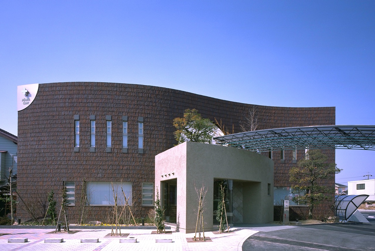 前面道路のカーブにあわせて、それと対照様にうねった壁のファサード