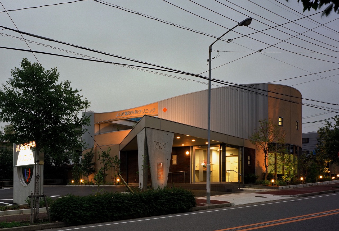 駐車場側からの外観。2Fは左側に院長室等、右側に待合およびリハ室。上部吹き抜けと小屋裏となっている。中央は屋上バルコニー。